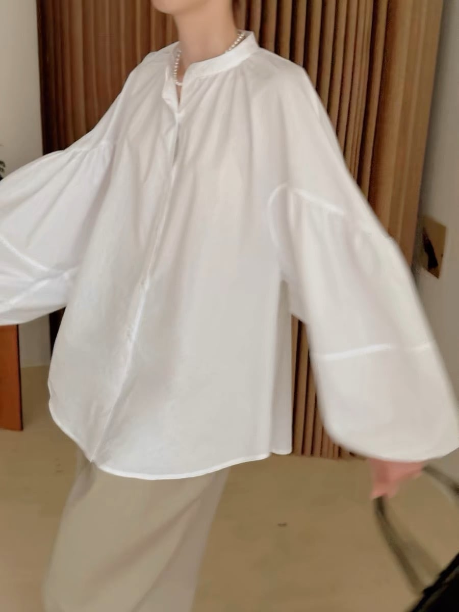 ボリュームたっぷりのバルーンスリーブが特徴の白ブラウス。シンプルなデザインながらも、袖の存在感がおしゃれなアクセントになっています。柔らかな素材で肌触りも抜群で、着心地も快適です。カジュアルにもきれいめにも合わせやすく、さまざまなシーンで活躍する一枚です。 このバルーンスリーブブラウスで、あなたの日常にちょっとした華やかさをプラスしてみませんか?オンラインショップから是非お試しください。 ※お取り扱いには、洗濯機をご使用の際はネットをご使用ください。